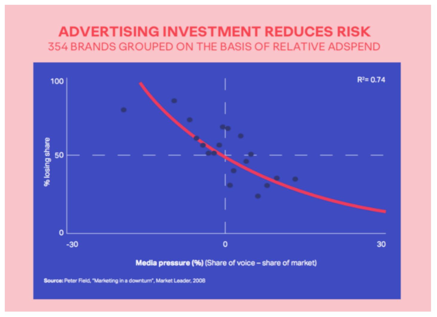 This research, posted by Ogilvy and done by Peter Field on "Marketing in a downturn" shows that if brands decrease their marketing spend, they stand a greater chance to losing their share of voice and share of market.