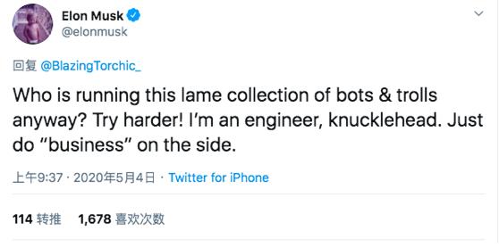 想到马斯克前两天在推特怼网友时说的:“我是工程师,蠢蛋。只是顺便兼职做做生意。”我不禁酸了。