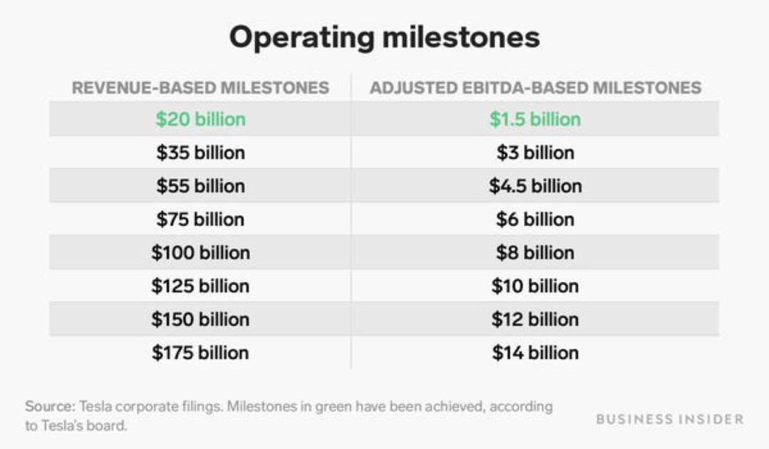 因此,Tesla的里程碑分为市值里程碑和运营里程碑,其中后者需要同时满足收入和EBITDA两个子里程碑。