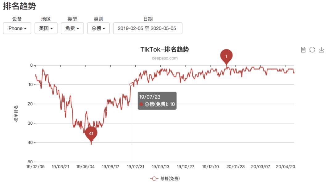 我们也可以看看美区的App Store的榜单数据,相互验证一下。TikTok在2019年7月份以后,排名长期在前10左右,后面一段时间更是在前5左右稳居不落。