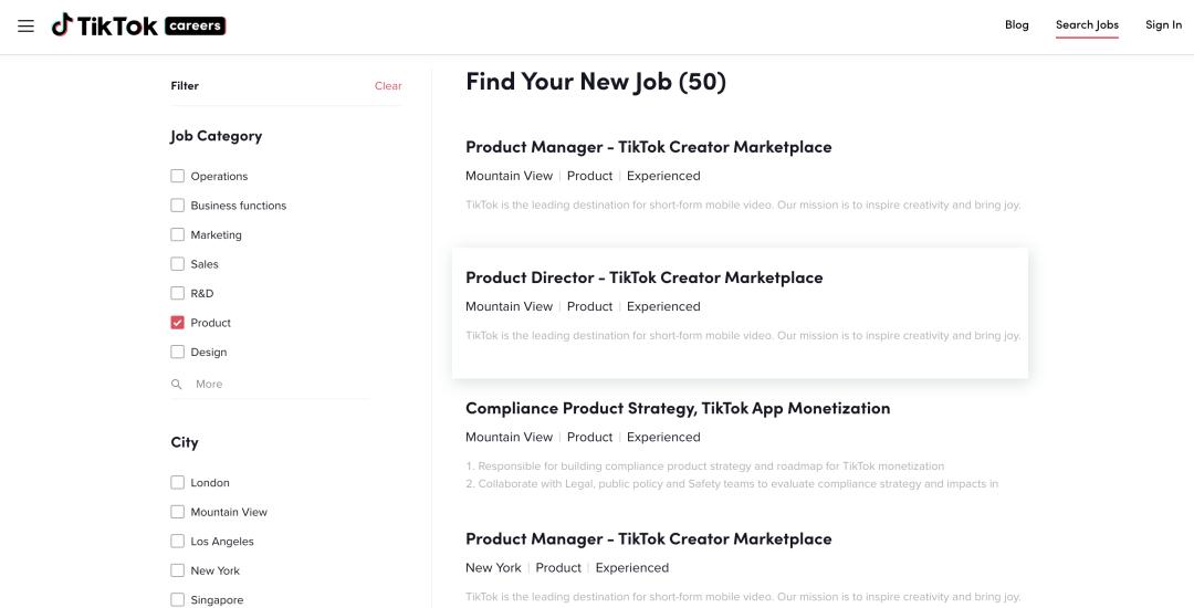 从TikTok的招聘网页也可以看到,多个地区,多个岗位都开放了很多职位,招揽当地的优秀人才。