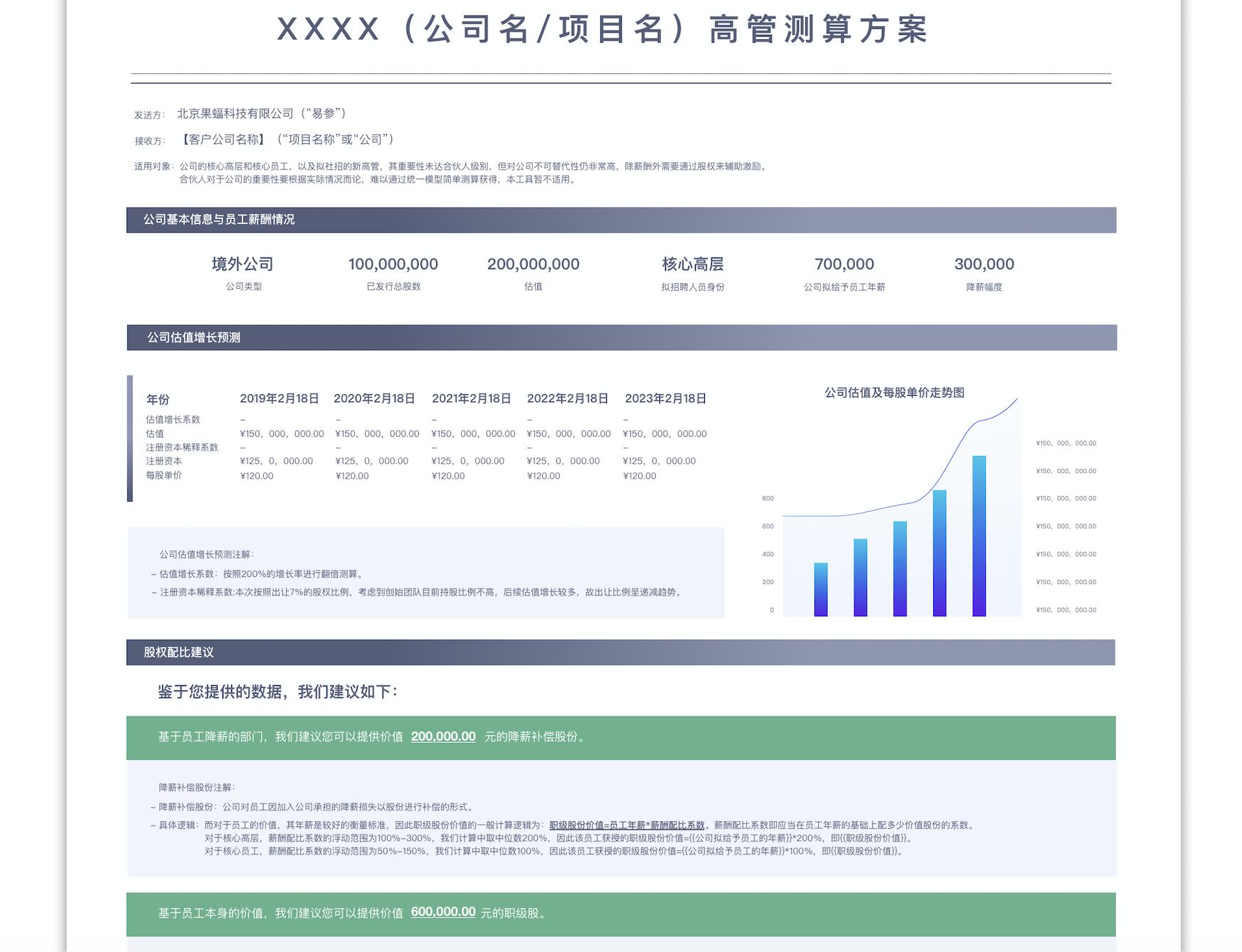 目前「易参」服务的客户数量为近1000家,2019年相比2018年客户数量增长了3倍,营业收入增长了4倍,并且保持持续盈利。在收费模式上,「易参」分为订阅制和项目制两种模式,订阅制是用户使用系统管理股权的账号费用,项目制收入主要来源于「易参」股权配比系统生成的个性化解决方案。
