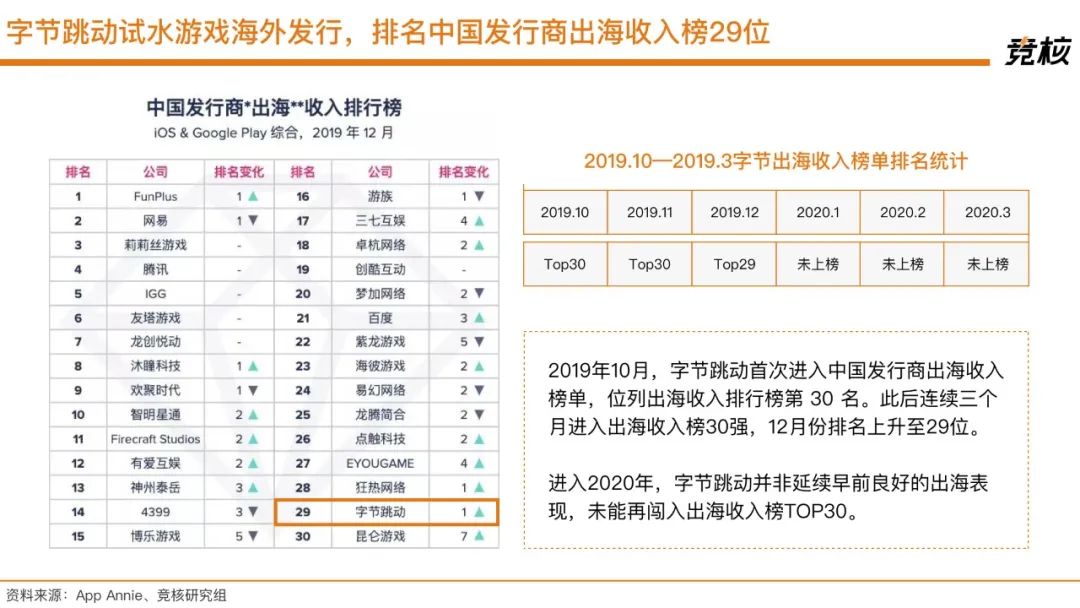 自2019年10月,首次闯入中国发行商出海收入榜Top30后,连续2个月上榜。进入2020年,字节未能进入出海收入榜。眼下字节游戏的出海表现并不好。