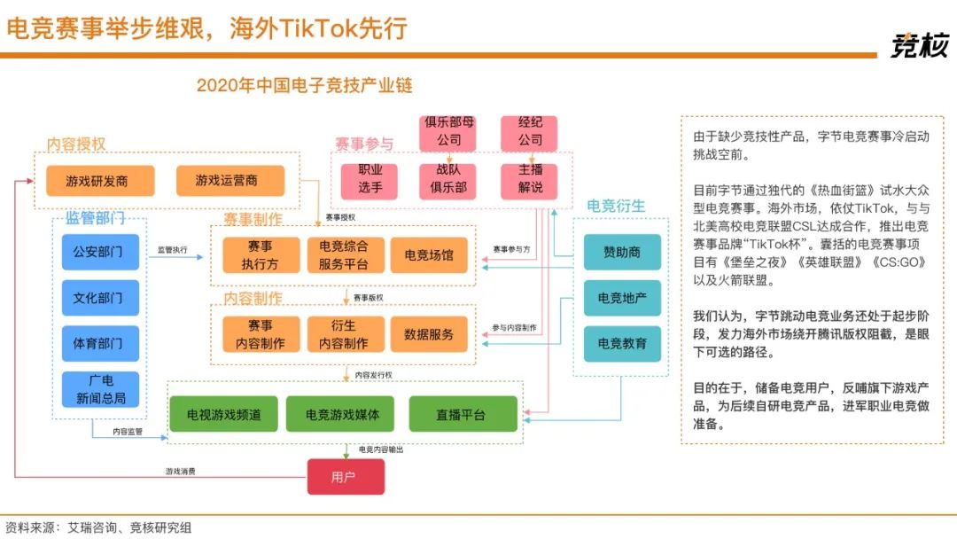 字节跳动如何做游戏直播电竞赛事?国内自研竞技性产品尚未出炉,缺少游戏版权,游戏直播、电竞赛事举步维艰,前期试水大众型电竞赛事。海外TikTok先行,打造高校联赛。