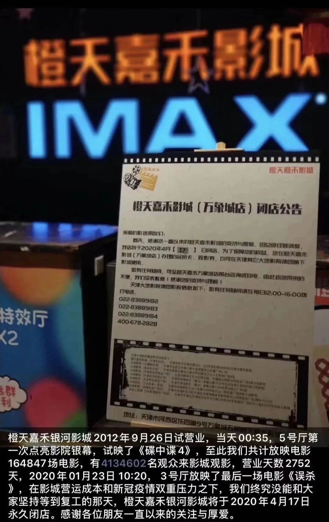 上个月,位于天津河西区万象城的橙天嘉禾银河影城永久闭店,这家已经营业了2752天、放映了164847场电影、接待过超413万名观众的门店,成为了天津市区第一家关闭的影城。