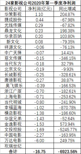 进入5月,影视类上市公司的2020年第一季度业绩陆续公布完毕。据统计,24家上市公司中只有6家实现了盈利,18家亏损,超过2/3的上市公司收入下滑超过50%。仅有的几家盈利的公司中,只有3家的净利实现了同比增长。