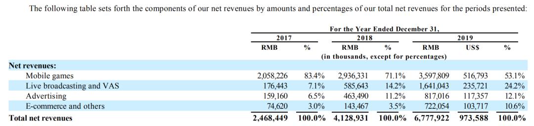 从结果上来看,直播业务总体表现较为亮眼,从2017年占总收入的7.1%上升至2019年的24.2%。电商业务也在不断发力,从2017年的3%上升到2019年的12.1%,此外陈睿本人在今年的电话会议中表示,2020年将加大与阿里巴巴的合作。