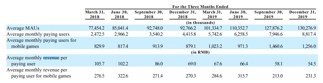 数据显示,近年来B站的每用户每月付费金额(Average monthly revenue per paying user)正在减少。2018年第一、二、三、四季度的每用户每月付费金额分别为105.7元、201.2元、86元、69元,而到2019年相应数字则变为67.6元、66.4元、58.1元、54.5元。