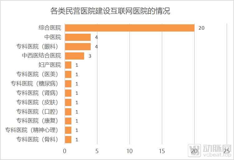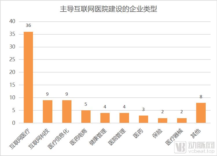以上是我们本次统计的企业主导型互联网医院中,各类企业的数量。互联网医疗、医疗信息化、医药电商等仍是主力,其他企业类型多样。