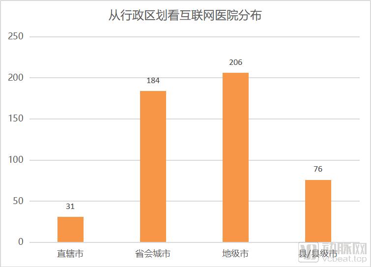 从上图可看出,总共有200多家互联网医院位于直辖市和省会城市,200多家在地级市,县级城市有76家。