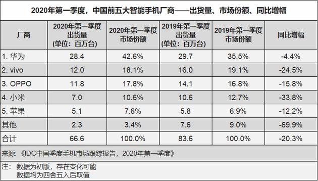 IDC的2020年第一季度中国智能手机市场报告还显示,华为以42.6%的市场份额排名第一,vivo(18.1%)、OPPO(17.8%)分列二、三位。小米以10.6%的份额位列第四,苹果第五,份额为7.6%。