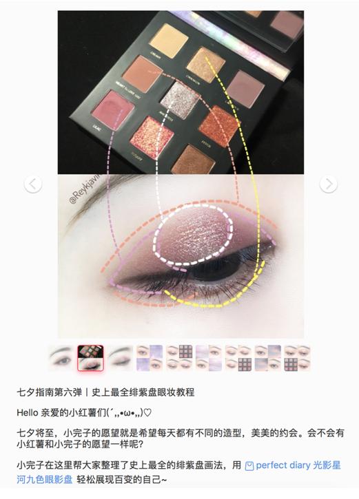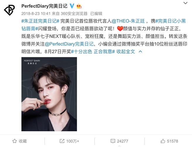 直至2018年8月,完美日记还在小红书上策划了一场“七夕指南”的活动,着重推荐眼妆和唇妆产品。七夕过后不到一周(8月23日),完美日记即在微博上官宣了首位代言人——NINE PERCENT成员朱正廷,该条微博转发量破百万,而在此之前的微博转发量大部分为个位数甚至0转发。(除代言人预热外)