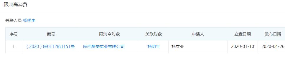 2020年4月26日,因房屋买卖合同纠纷遭到起诉,陕西聚安实业有限公司(简称:聚安实业)未按期执行给付业务,西安市未央区人民法院发布了对及单位主要负责人的限制高消费令,受此关联,杨明生被限制高消费,截至目前,限高令还未解除。
