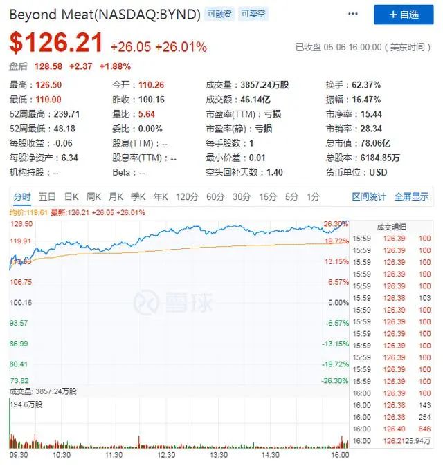 因本季度营收跟净利润表现大大超过分析师预期,Beyond Meat股价周三大涨26.01%,收报126.21美元。截止文章发稿,Beyond Meat盘后股价为128.58美元,盘后涨了1.88%,市值为78.06亿美元。