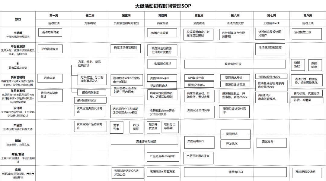 大促对于电商人来说是非常考验能力和精力的一项挑战,作为一名优秀的项目PM,要对活动有整体的把控和规划,对于各个部门工作事项有个明确的界定,执行落地到人,避免出现信息间隔。