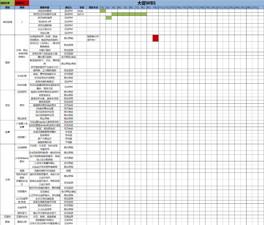 我们把一场大促活动项目分解成项目管理/规则/货品/流量/会场/资源位/数据等几个大版块,然后再跟进这些大版块逐一的分解成N个小事项,每个小事项都有具体的完成时间、负责人、项目状态和项目卡点。
