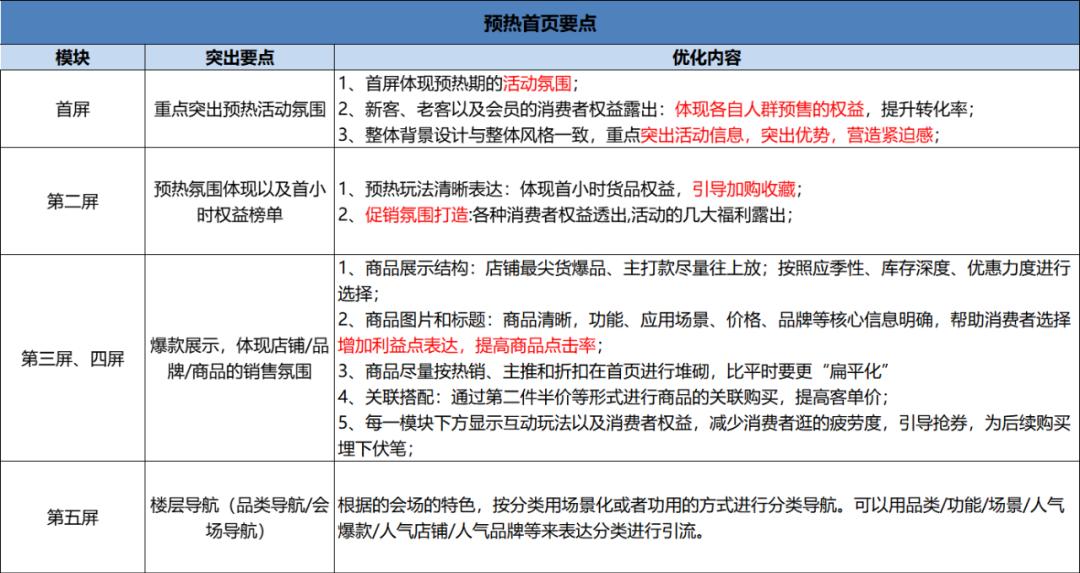 通过营造预热页面的活动氛围和整体页面布局的合理性,加强活动利益点突出,告知用户活动信息,引导用户预热期加购收藏,为正式期活动蓄水,从而提高正式期用户购买商品的转化率与购买数量。