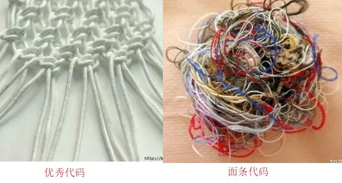 优质代码是容易实现团队间密切合作的,而且很少产生误沟通,因为非常清晰有条理。左边和右边,显然左边团队协作开发成本是低的,右边不但难找到线头,可能会常常找错线头。