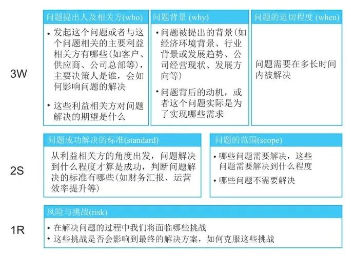 麦肯锡咨询公司因此开发了一套问题分析表来帮助咨询团队搞清楚问题。它还有了另外一个名字:“321表”。因为它是靠3W-2S-1R这三个部分串联而成的。
