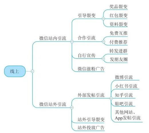 举个例子,如果领导让你运营公司的微信公众号,你前面几步都搞清楚了,议题树也做好了,我们这里只选取线上部分来制订解决方案,这是该议题树的线上部分(如下图)。