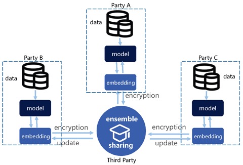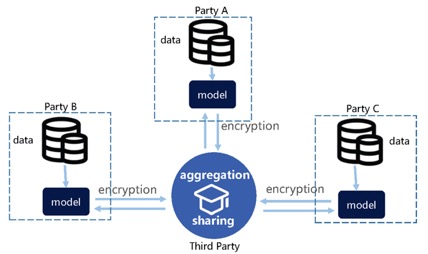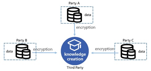 在知识联邦中,第三方的存在只是一个协调者和监管者作用,不会触碰参与方的原始数据。事实上,第三方可以是虚拟的,只是一个可审计和可追溯的机器。在数据参与方都达成共识的情况下,虚拟第三方可以部署在更担心数据安全的一方的私有云上,也可以部署在都认可的公有云或专有云上。第三方也可以是实体机构,一般是一个中立的、可信的机构。