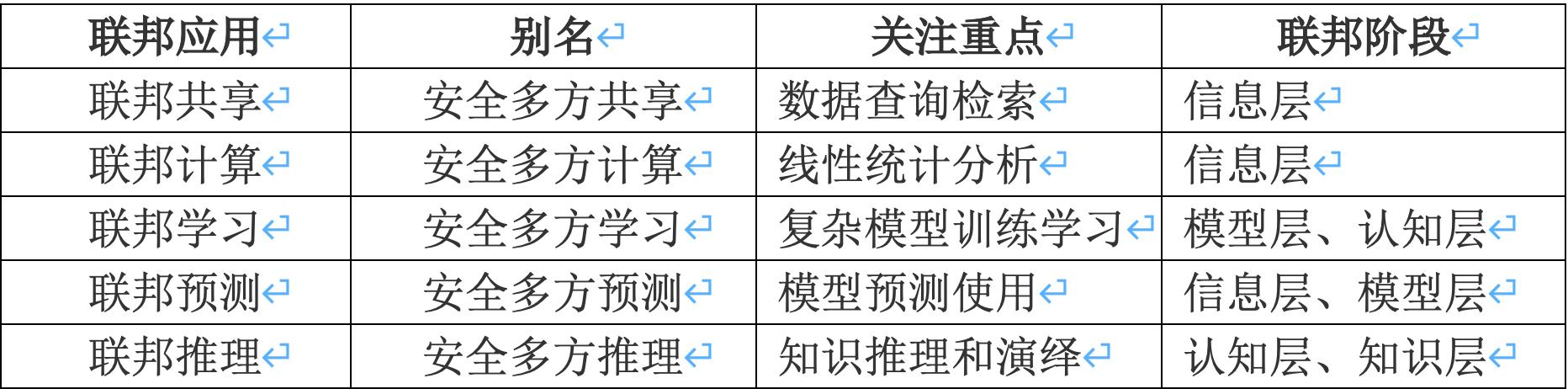 知识联邦关注的是通过联邦提取有用的知识,其联邦的目的可能是建模、预测、计算、推理。知识联邦不仅仅是面向学习,还包括安全的多方计算和知识推理。联邦学习更多是知识联邦中模型层联邦,而知识联邦除了包括模型层联邦外,还包括信息层、认知层和知识层等几个层级的联邦。因此,联邦学习是知识联邦的一个子集,专注于数据分布的联合建模,详细讨论参见章节3.4.3。知识联邦关注的是安全的数据到知识的全生命周期的知识创造、管理和使用及其监管,设计目标是面向生产环境的完整知识联邦生态系统,致力于推动下一代人工智能,不仅仅是一个安全的联合建模。