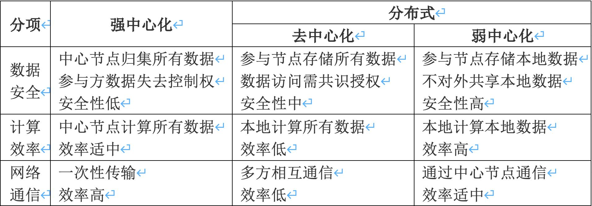 在实践中,知识联邦采用的是弱中心化的分布式方法,这与传统的强中心化和完全的去中心化还是有很大差别的,如表1所示。
