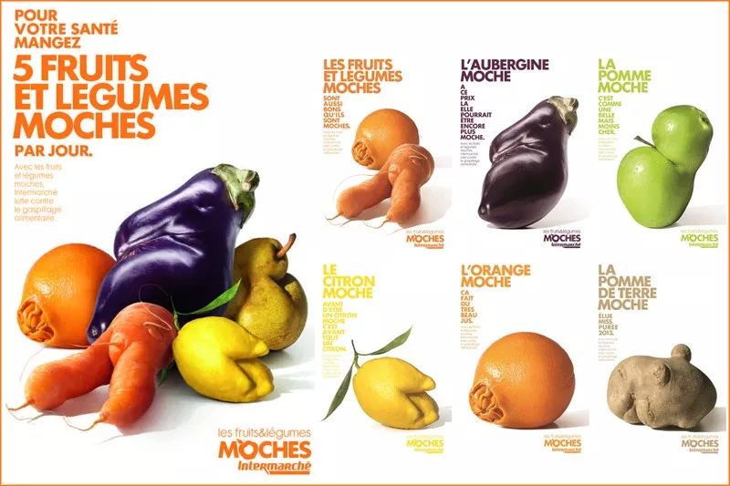例如,一家法国超市为避免“蔬果因畸形”而造成的食物浪费,便用创意为这些蔬果做了一系列海报,配上讨喜的文案,腾出专门的陈列货架、采用统一的设计包装,并以低价折扣价格出售,它同样是在盈利的同时提倡了拒绝浪费食物的公益观点。