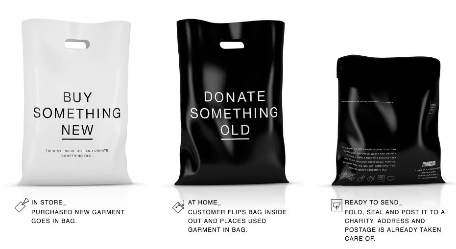 瑞典一家服饰品牌Uniforms for the Dedicated,为了鼓励大家把家里的旧衣回收,就设计了一个可以直接帮你回收旧衣的购物袋《The Rag_Bag》,消费者买完新衣服回到家后,只需要把购物袋从内到外翻过来之后,就成了一个已付回邮的袋子,而且还可选择受赠单位的回收旧衣袋,可以让让消费者想捐的衣服放进去,寄出,就OK了。