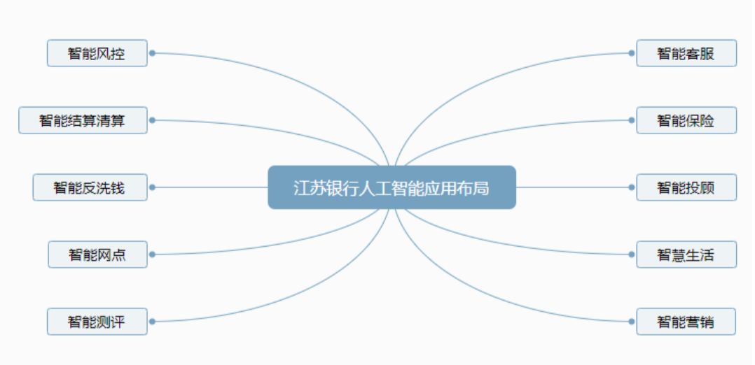 从应用布局上来看,江苏银行在银行主要业务上都有相应的人工智能应用。在江苏银行发布的2019年年度报告中,可以发现江苏银行在保险、投顾、客服、生活缴费、营销、风控、结算清算、反洗钱和网点等业务条线上都有人工智能相关应用布局。