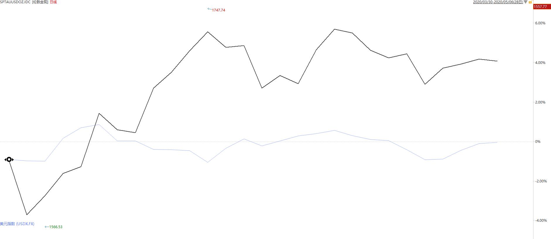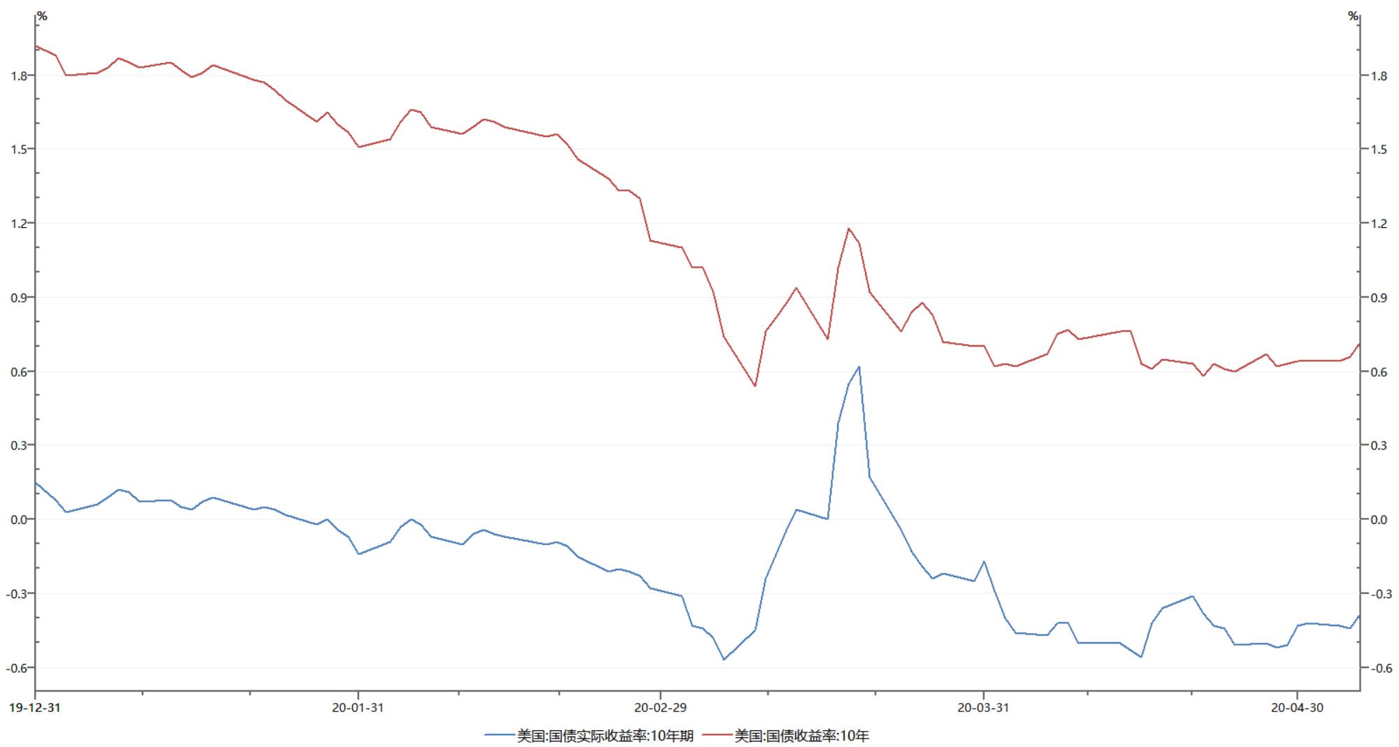 收益率曲线变陡,倒挂现象解除,表明市场对于未来的经济预期已经由过去的悲观转为乐观,十年期美债收益率已经跌至历史的低位,且整个四月持续震荡,当前仍然处于震荡下箱体的下沿,而未来美国加大财政刺激可能会供应大量的美债,另外美国总统特朗普已经开始持续释放复工的预期,若这两件事发生,美债名义收益率大概率会上行,从而打压黄金。