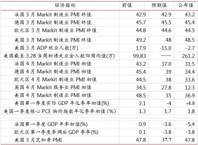 欧洲和美国三月份疫情开始大幅蔓延,对应的封锁措施也是在三月份开始实施的,所以欧美地区三月份的经济数据均出现了大幅回落,法国、德国和英国的3月Markit制造业PMI均远低于荣枯线,法国仅录得43.2,欧元区录得44.5,德国录得45.4,美国3月Markit制造业PMI终值录得48.5,而对应4月Markit初值更是进一步下行,欧元区主要经济体制造业PMI初值均处于40以下的极低水平,对应的第一季度的GDP增速均录得不同程度的下滑,其中欧元区第一季度季调后GDP季率为-3.8%,而美国第一季度实际GDP年化季率初值仅仅为-4.8%,为经济危机以来的最差值。