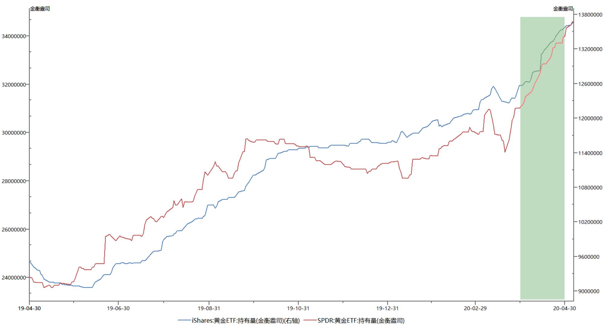 伴随着黄金价格的持续走高,投资黄金的资金也跟随入场,其中iShares黄金持有量持续增加,已经创出历史的新高,实际上iShares黄金持有量已经增加至1367.5万盎司,黄金持有量较2016年底已经翻番,而SPDR黄金ETF持有量4月份明显快速上升,2020年4月1日SPDR黄金的持仓量为3114.64万盎司,至四月月底SPDR黄金ETF持仓量已经升至3396.75万盎司。两个ETF基金的持仓量一个月增加近400万盎司,从增幅看,已经创出了金融危机以来的新高。