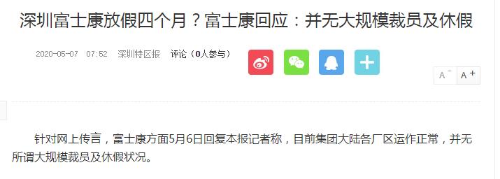 此消息一出,引起了很多人的热议,不过富士康官方已做辟谣,称目前集团大陆厂区运作正常,并无所谓大规模裁员和休假情况。