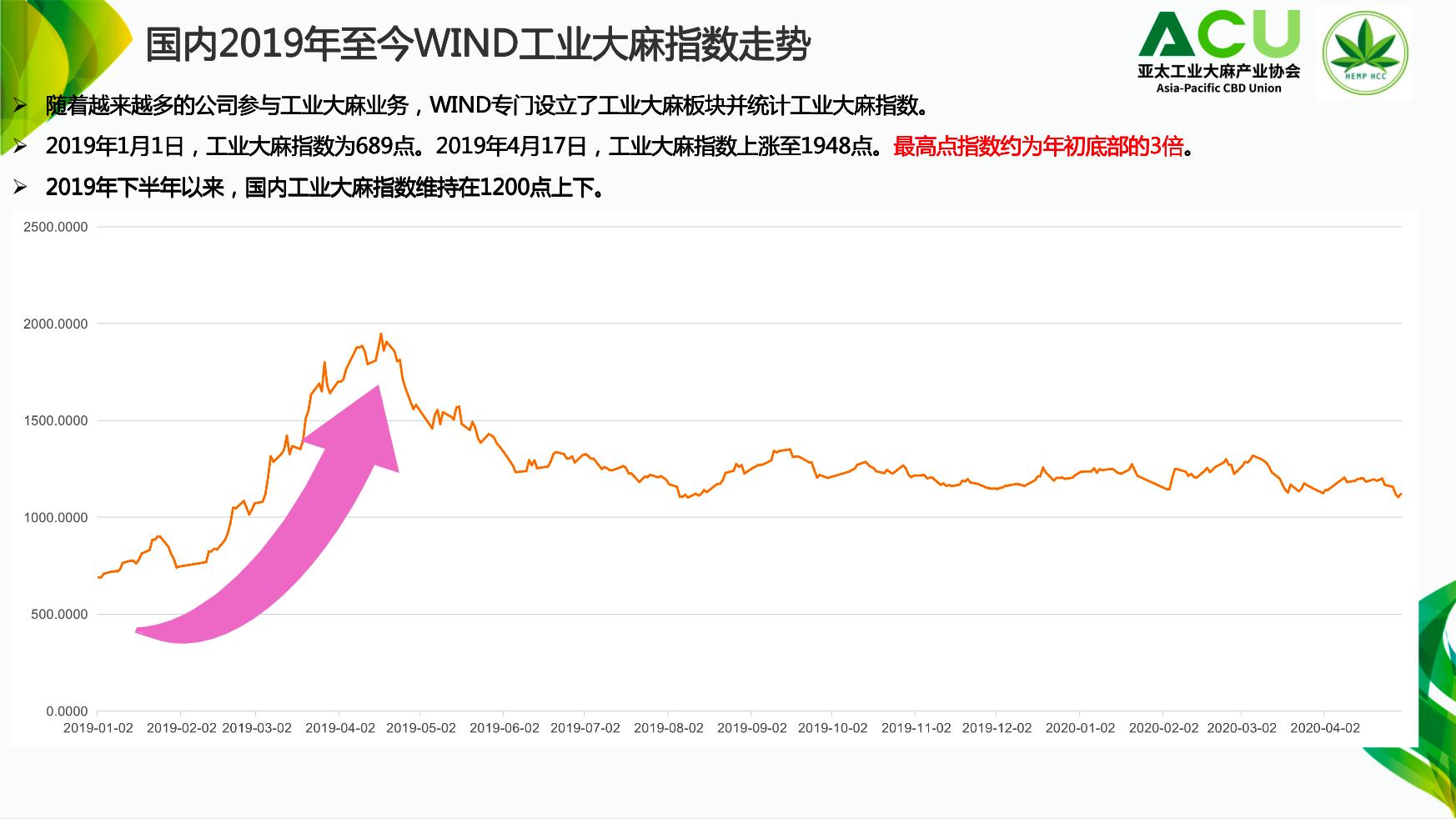 2019年的越来越多的公司也参与了工业大麻的业务,wind也设立了工业大麻板块统计指数,在年初的时候是689点,今年4月份也是工业大麻指数高点1948点,最高是年初的3倍,现在是1200以下,同比都有一个大幅地回落,也反映出来市场的一个波动。