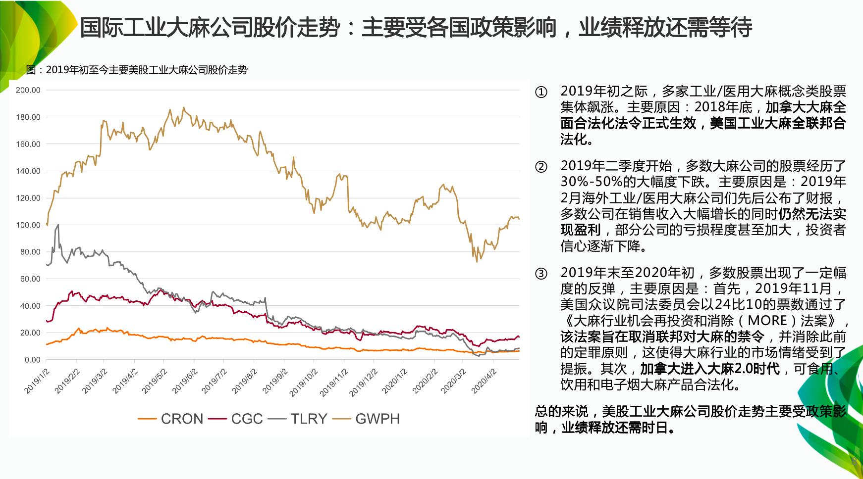 这是一张全球的四大工业大麻相关标的的走势图。我们也看到全球在开始上市的时候有一个价格的暴涨,后来开始回落。为什么暴涨?因为2018年底的时候,加拿大的大麻全面的合法化生效,所以美国工业大麻也是全联邦的合法化。G7里面这两个重要国家的政策突破导致了市场预期上涨。二季度的时候,多数的企业股价有所回落,包括中国的工业大麻企业也是有所回落。但其实海外的企业的财报公布之后,大家看到,在销售收入大幅增长的同时,(很多工业大麻企业)仍然没有办法实现盈利、有的企业还出现了亏损,加上整个市场波动,导致投资者信心的下降,价格的回落。在去年年末、今年年初的时候,尤其是一些龙头企业的国家又出现了上涨反弹,无论是Cronos、Tilray,还有Canopy这样的公司,都出现了一个反弹,原因也是看到了政策的预期,包括美国众议院的司法委员会也高比例的通过了大麻行业机会再投资和销售的法案,正在消除联邦法院的一些禁令。另外,加拿大进入了工业大麻2.0的时代,可食用、饮用的,包括工业大麻的电子雾化类产品已经开始进入消费者的视野。我觉得目前来看,无论是国内还是国际的工业大麻大盘走势,主要还是受政策的一些影响,具体的释放还需要等待。
