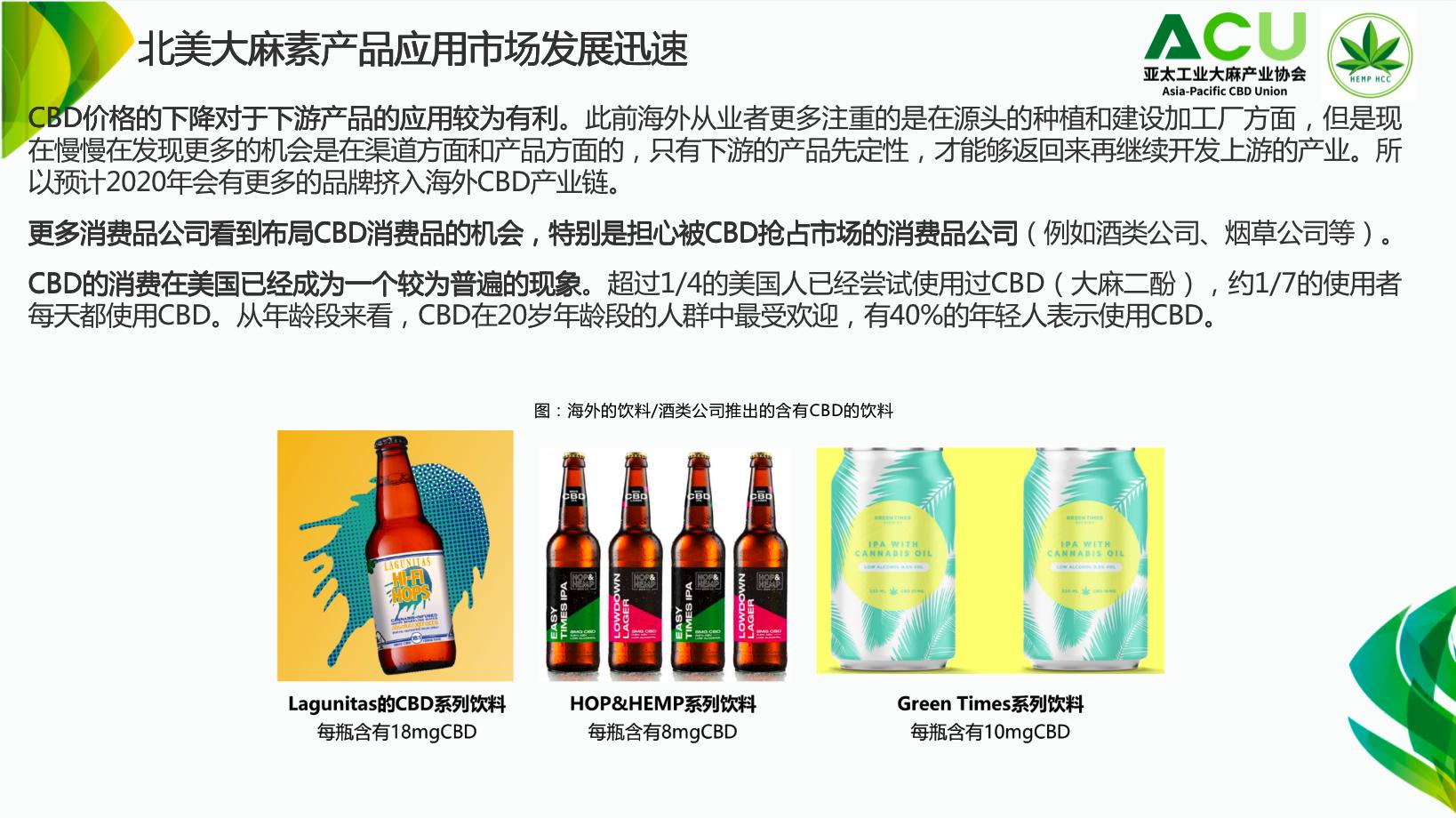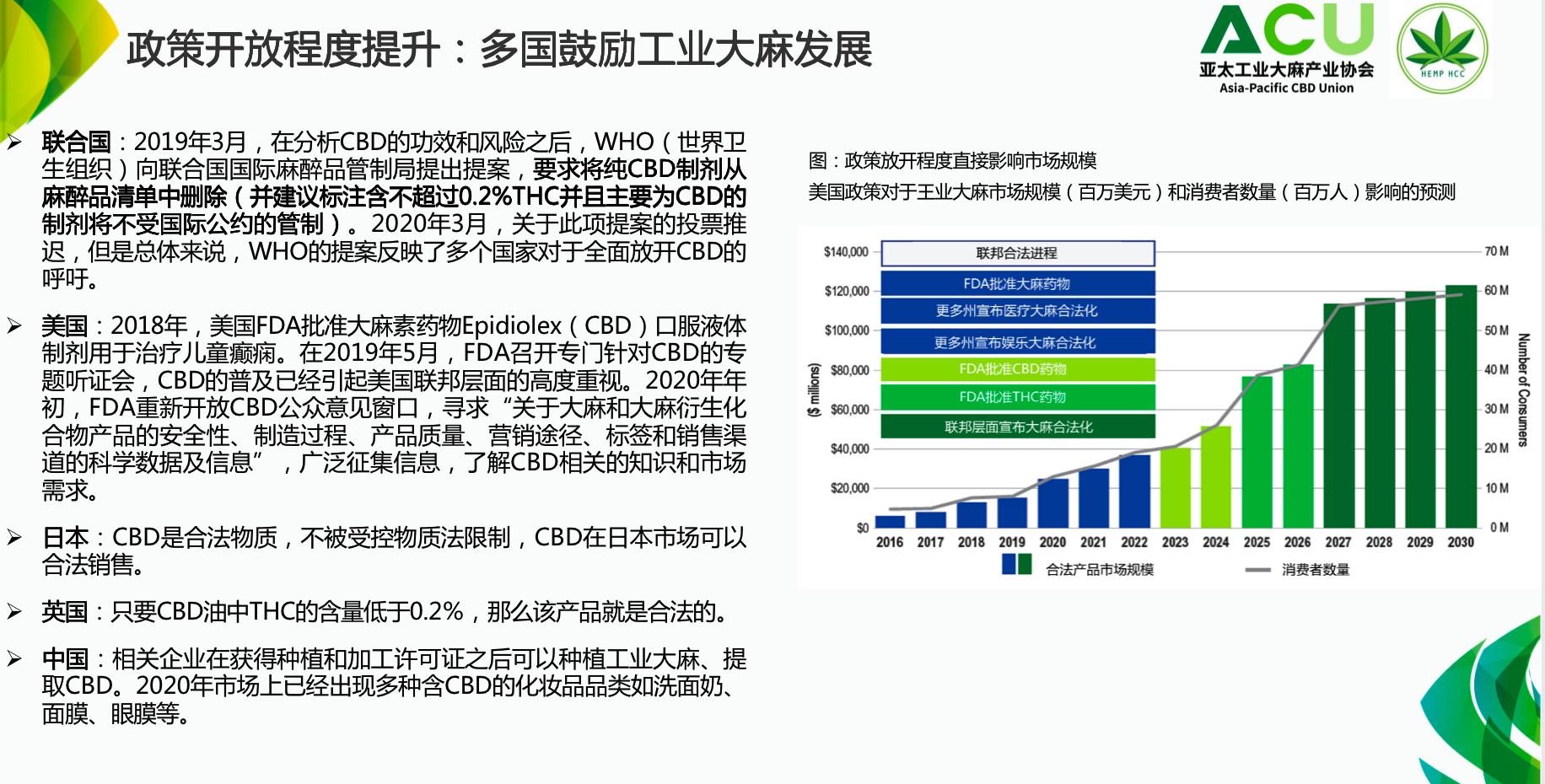 所以我们看到了:反对的并不是工业大麻,这里有一个很好的区分。大麻用于医疗健康的趋势已经在全球兴起,特别是在治疗癫痫、抑郁症、精神疾病上,获得了很大的认可。我们也看到了美国,不光是在医用,已经被广泛地应用到食品饮料里面去。前一段时间,我们跟美国的两个创始人有一个交流,加州或者很多州已经开始全面地可以买到CBD的水、饮料等等。FDA关注的点,你不能声称成饮料或者保健品有什么作用,只要CBD的含量是符合规定的,原料是来自于工业大麻都是可以的。这里当然不能理解为:FDA是反对CBD的添加,不是的,FDA关注的是CBD有没有对孕妇和儿童的负面作用,对这些细节的关注。FDA在今年2月份也认证了首款CBD的成药,在药里面已经有好几个相关产品,至少两款重要的产品,一个是癫痫,还有止疼药。今年3月份FDA也重新开始开放无限期的给FDA的评论,我相信这反映出来:FDA对公众反馈是有反应的。FDA需要对于大麻作物的安全性的过程和质量,以及它的途径、标签和销售渠道的整个流程保持关注。我们也觉得,这样规范之后,非常有利于CBD在各个产业的应用。我们也看到,不光是美国,包括中国,像澳大利亚、德国、日本、韩国、巴西、英国,从趋势来看都是支持这个产业的发展。