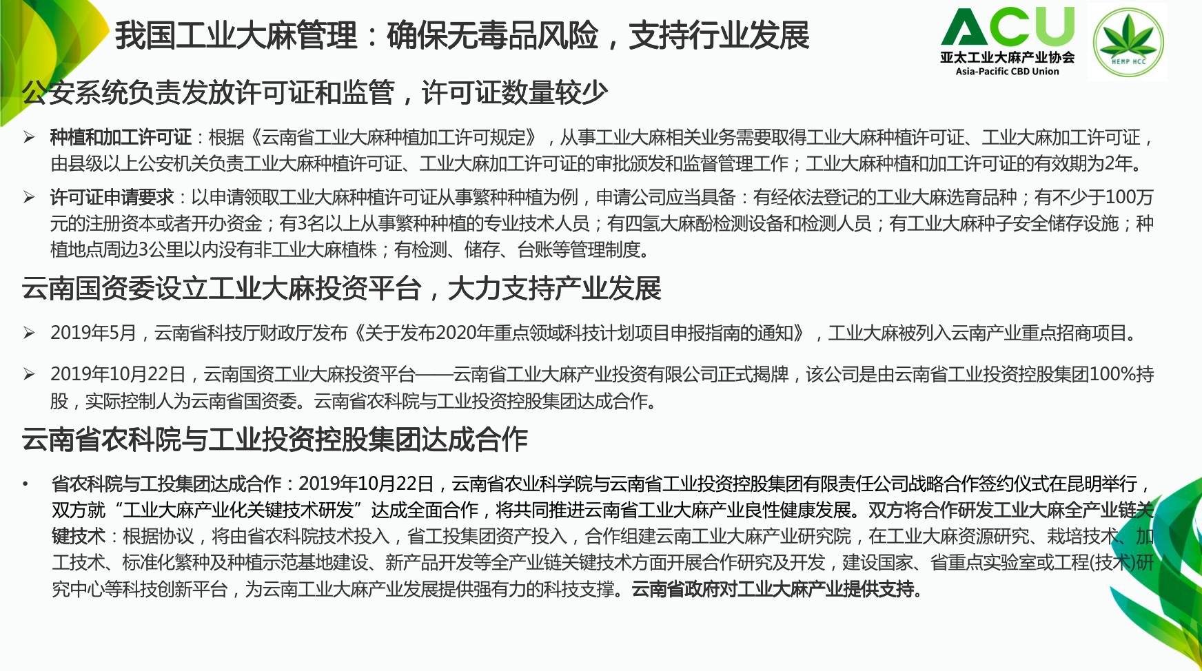 我们也看到了国家层面对这个产业的认可。云南省国资委设立了工业大麻投资的平台,大力支持产业的发展。包括云南省农科院跟工投达成合作,在整个工业大麻全产业链里面、关键技术里面等等都有了很大的协同。可以看到云南省政府代表国家的一个意志,对工业大麻的一个支持。