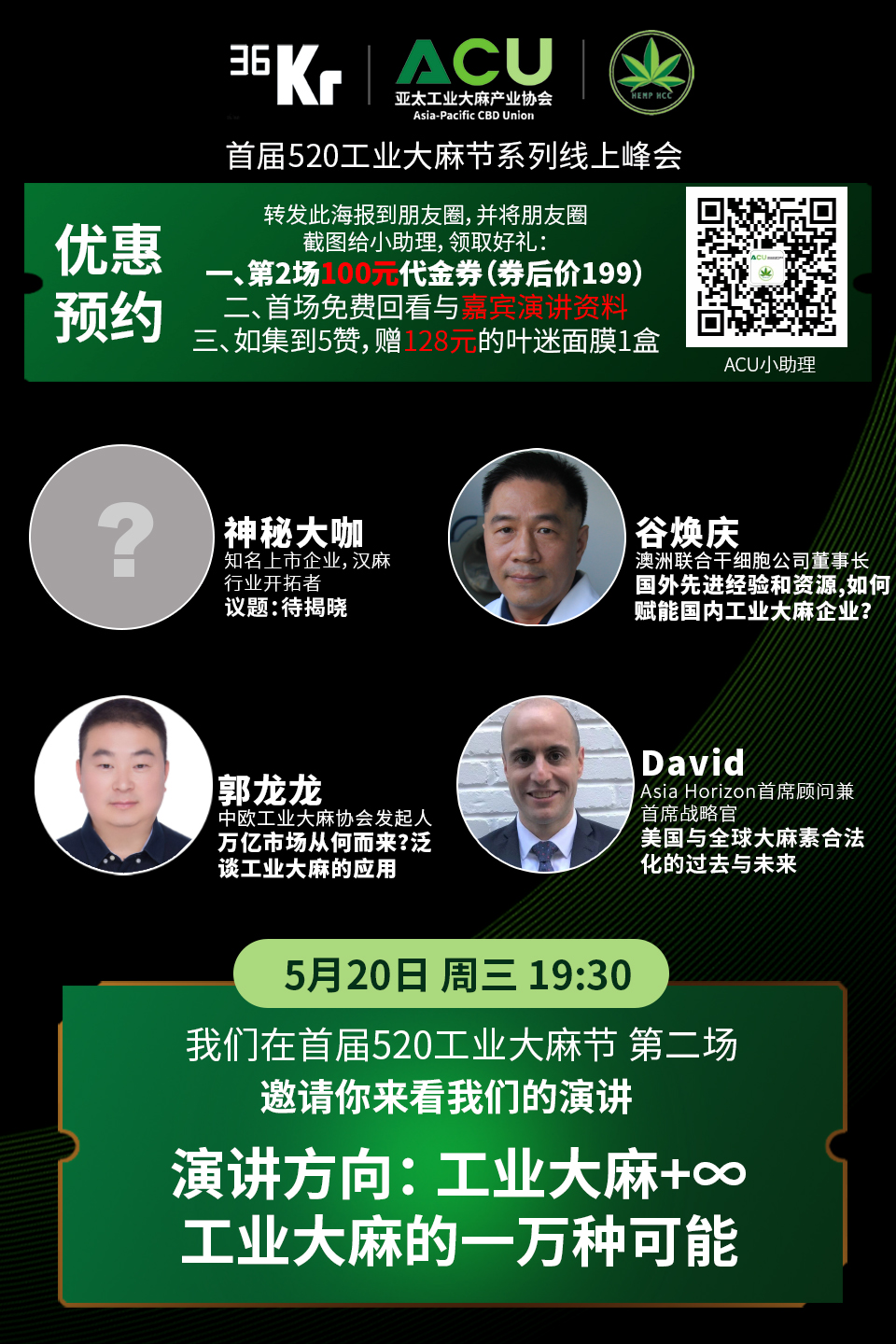 为了让更多行业内外人士了解工业大麻市场的最新动向,36氪联合ACU亚太工业大麻产业协会将共同举办首届「WISE2020领风者x 520工业大麻节」工业大麻主题论坛,在5月8日晚上19点举行首场线上工业大麻直播峰会。本次峰会从产业链上下游最新发展方向,对工业大麻产品消费趋势、工业大麻品类市场财富进行分析,为企业和消费者带来全方位的工业大麻专业资讯和创新机遇。