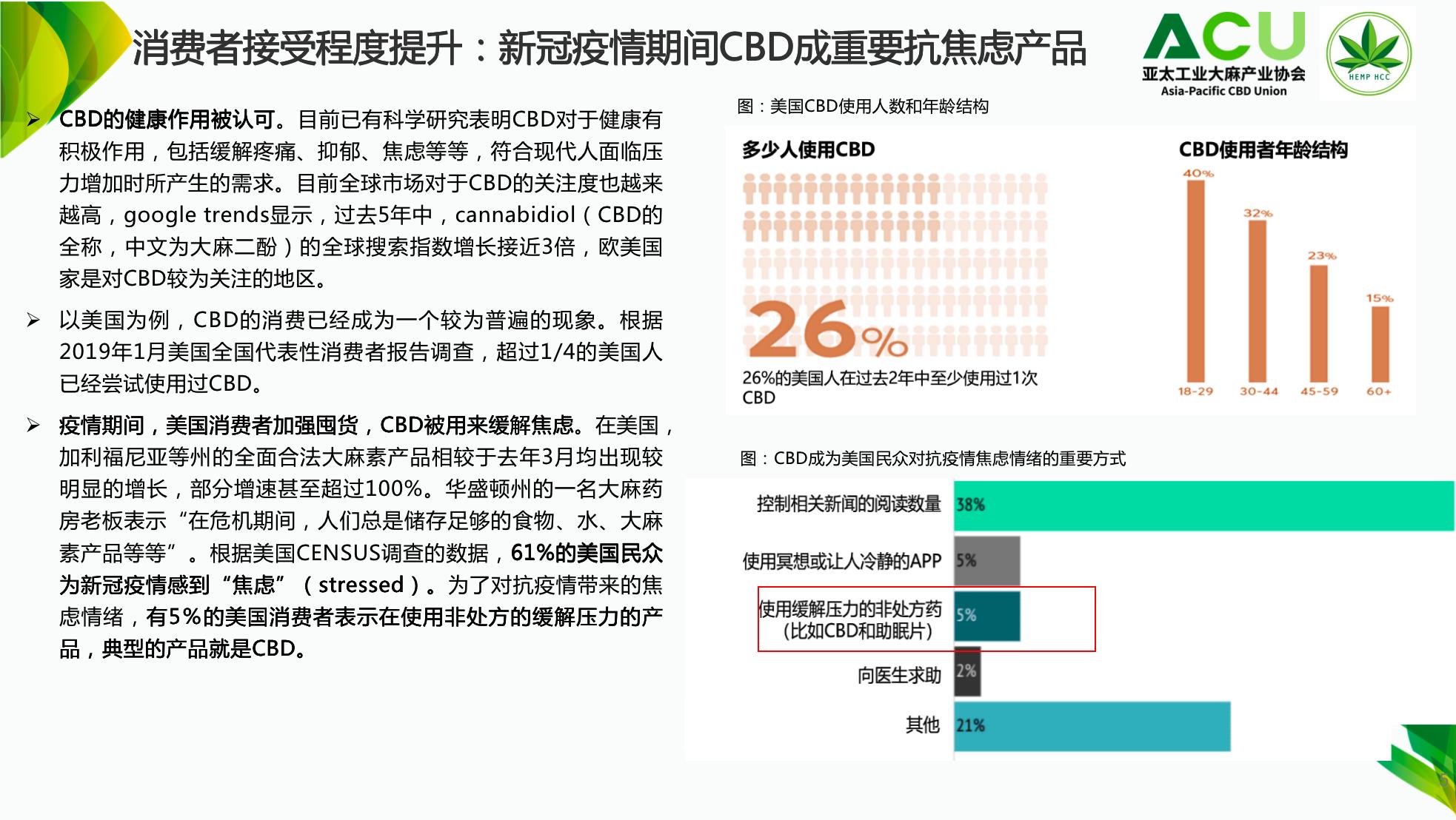 伴随着产品越来越丰富,消费者的接受度也是在大幅提升,因为现在新冠疫情期间,我们也看到了CBD的相关产品在美国已经成为抗抑郁抗焦虑的一个非常重要的产品,反映出来CBD的作用在逐步地被认可。