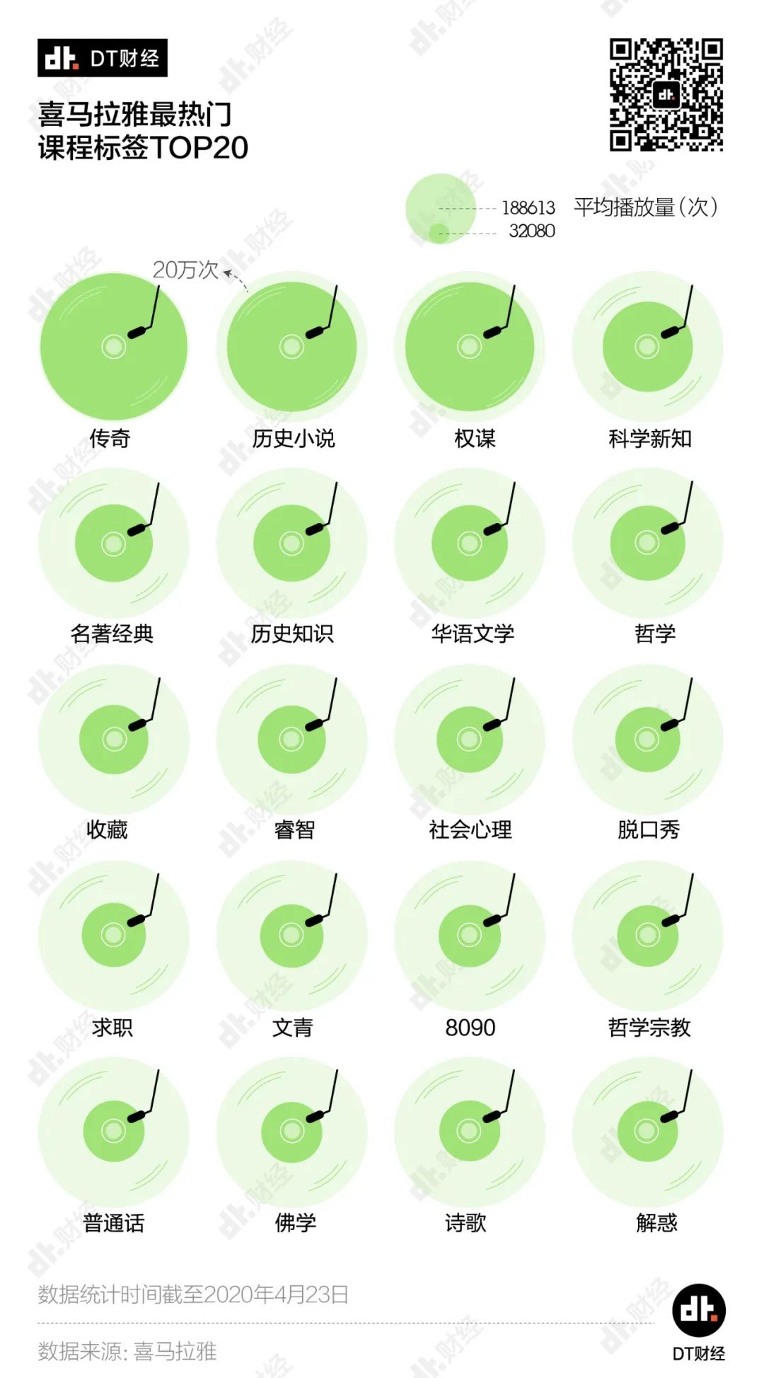 严肃知识的娱乐化并非由于媒介的变化而产生的。统计了喜马拉雅所有付费音频课程的标签之后,我们发现最受欢迎、播放量最高的标签包括“传奇”、“历史小说”、”权谋”等词,甚至“脱口秀”也是人气极高的一个课程标签。这些关键词似乎体现了人们的兴趣离“故事”更近些,离“知识”远了些。