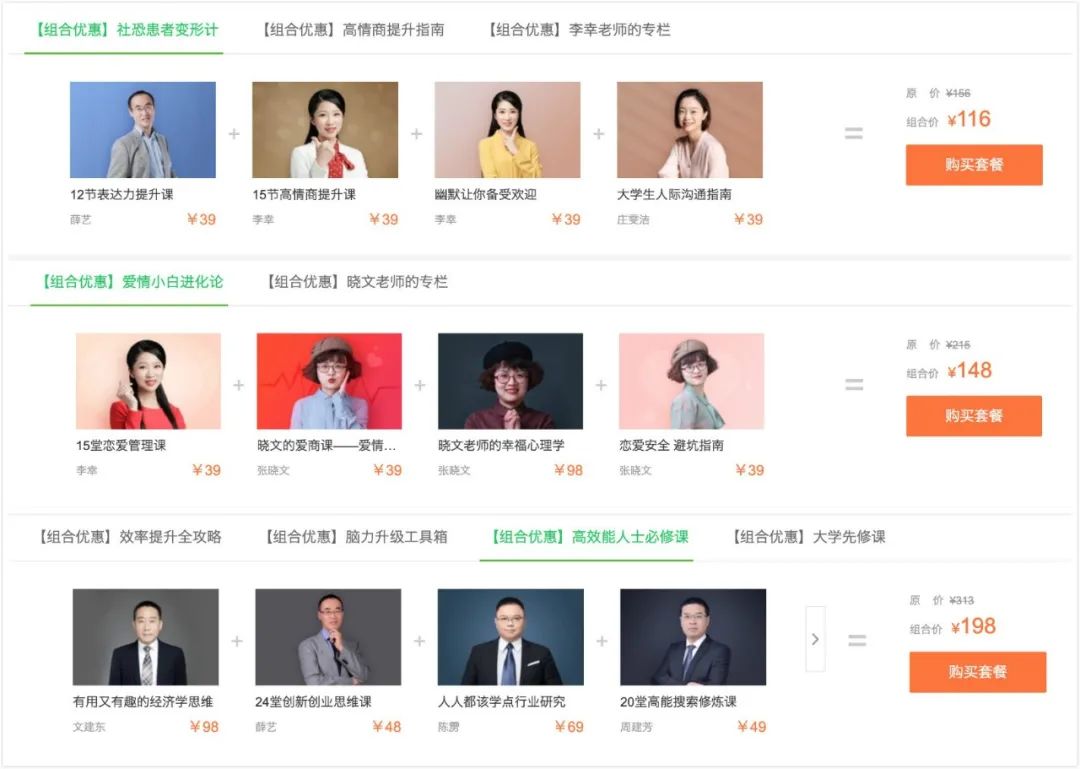 而终身学习板块的名师专栏,也似乎是面向社会新鲜人开设的。在这里不仅可以收获职场/创业学习方法,仅需198元就成为一名高效能人士,也可以在各种表达力、情商、社交技能课中完成社恐患者变形记,甚至母胎solo的朋友也可以通过付费课程蜕变为恋爱高手。
