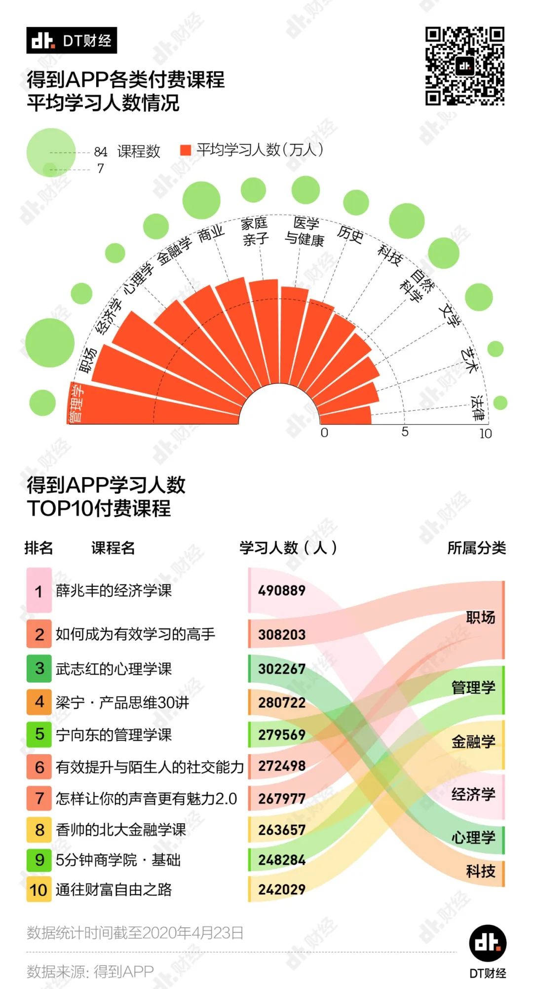 当把目光转向得到APP,这里的氪金学习者们对历史和人文的兴趣就没那么浓厚了。得到上职场、商业和科技相关的课程最多,但从平均的学习人数来看,大家最偏爱管理学、职场以及经济学的课程。