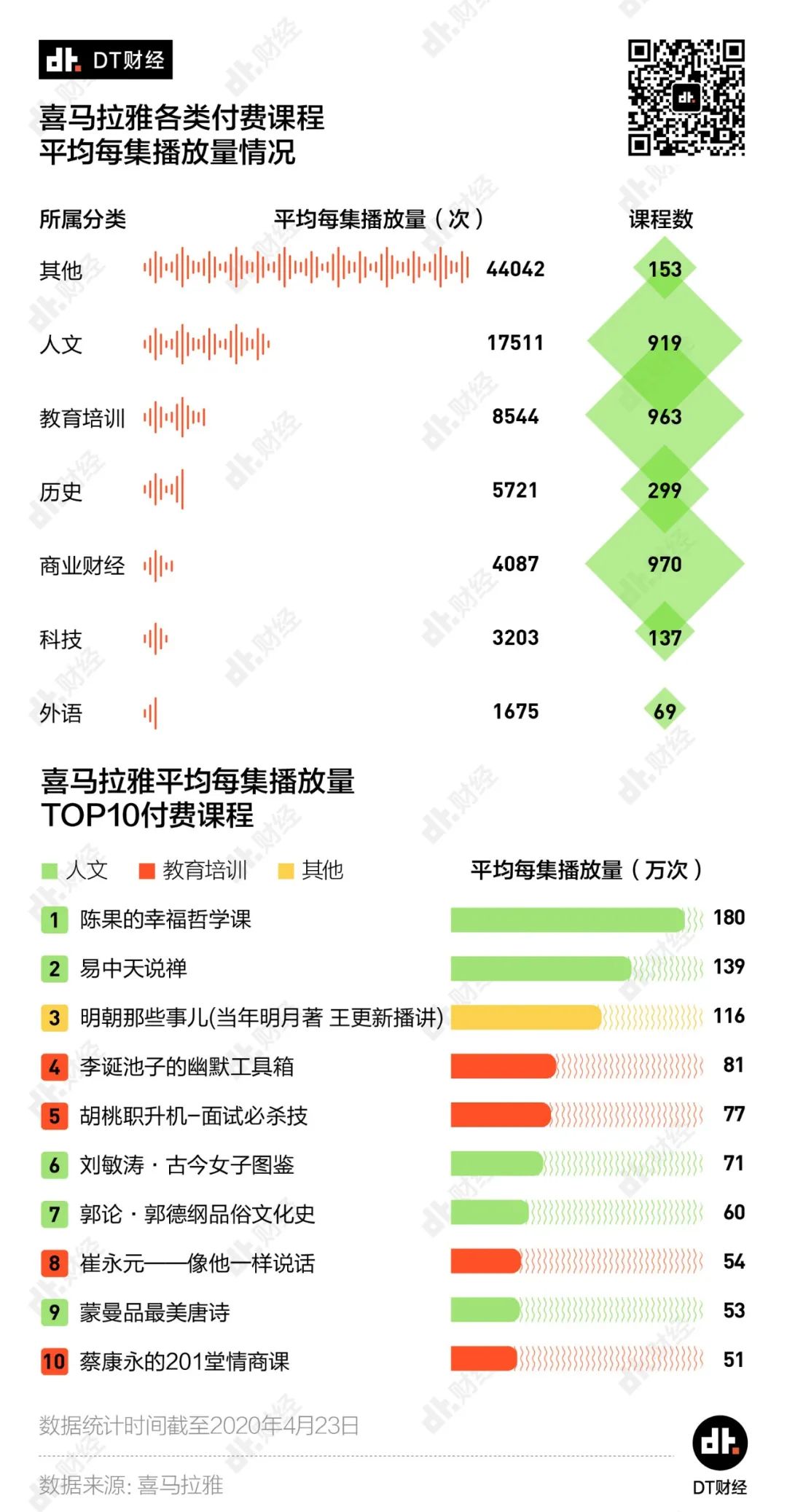 我们收集了喜马拉雅不同分类下付费课程的播放数据,总地来看,其他和人文分类下的课程人气最高,其次则是教育培训、历史和商业财经。