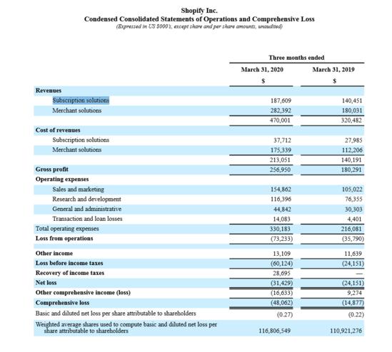 Shopify一季度的营业亏损为7320万美元,占收入的16%,而一年前同期的亏损为3580万美元,占收入的11%。2020年第一季度净亏损3140万美元,每股亏损0.27美元,而2019年第一季度净亏损2420万美元,每股亏损0.22美元。