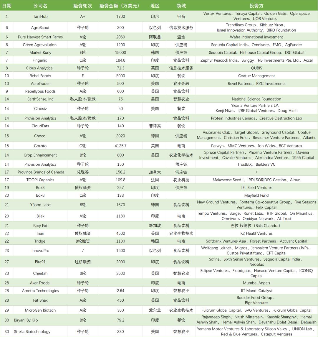 印度的最高额融资来自云厨房公司Rebel Foods的5000万美元E轮融资,印度本月融资总额近1亿美元;美国最高交易额来自农业生物技术公司Inari的4500万债权融资,美国地区总融资额为1.06亿美元。该月最高额的融资来自韩国的Market Kurly,交易额为1.5亿美元。