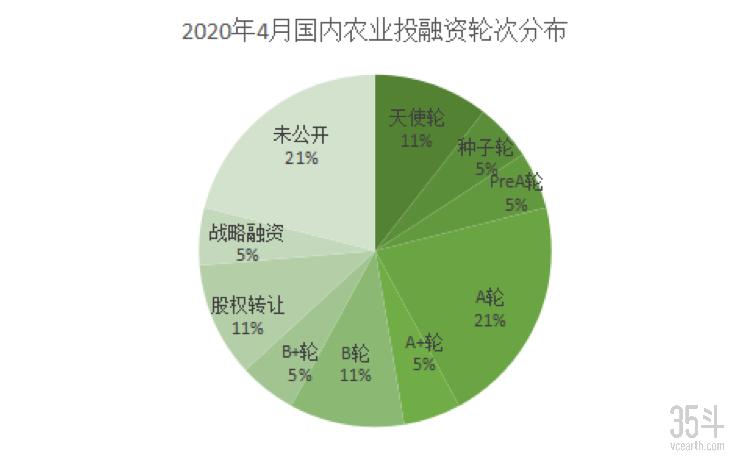 2020年4月,国内农业食品融资项目集中在B轮以前(含B+轮、B轮、A+轮、A轮、Pre-A轮、种子轮、pre-种子轮、天使轮),共12起,占63%。其中,A轮融资事件最多,共计4起。