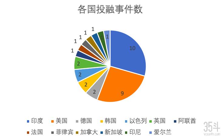 4月份,印度地区的融资事件数最多,共有10起;美国紧随其后,共有9起;其余地区的融资事件数均为1-2起。