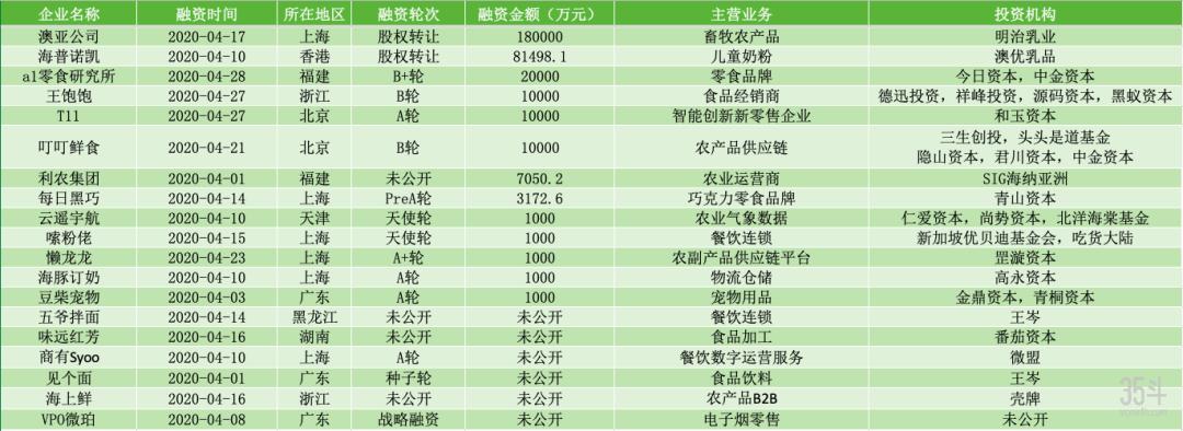 2020年4月国内农业食品投融资额TOP5