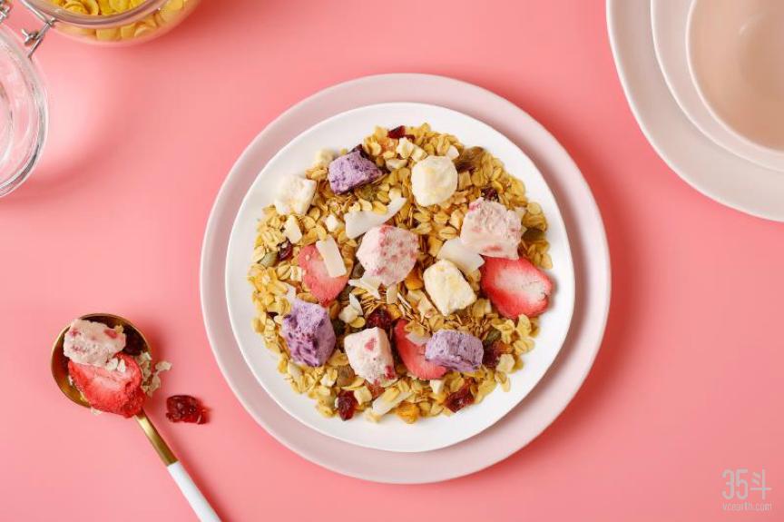 从选定品类到自建工厂,这个年轻的消费品牌,为了区别于桂格和卡乐比,王饱饱在产品方向上既不选择纯燕麦、也不做膨化,而加入了大果块酸奶块,采用低温烘烤的方式。
